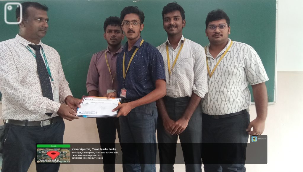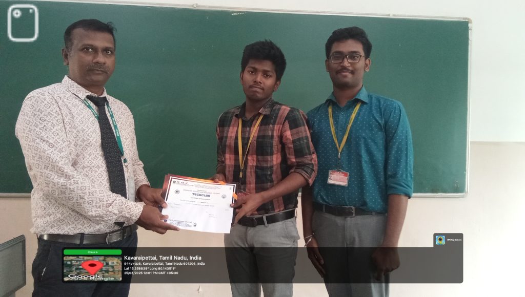 Mr. Barath Y, Mr. Diwakar S, and Mr. Balaji S have secured the Second Prize in the Project Presentation Contest organized by the Tech Club on 01 March 2025!