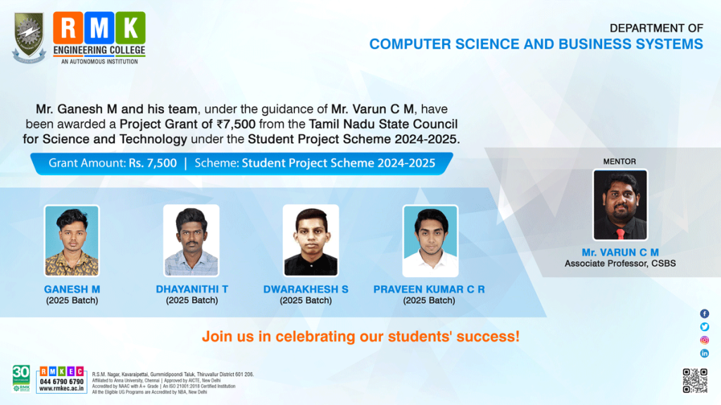 Mr. Ganesh M and his team, under the guidance of Mr. Varun C M, have been awarded a Project Grant of ₹7,500 from the Tamil Nadu State Council for Science and Technology under the Student Project Scheme 2024-2025!