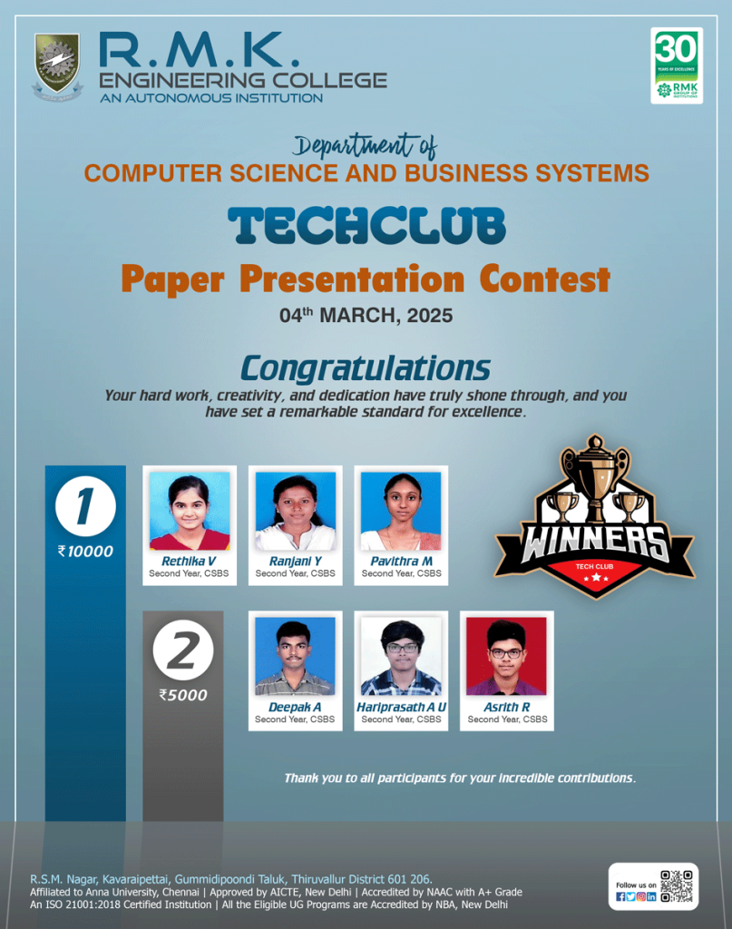 Ms. Rethika V, Ms. Ranjani Y, and Ms. Pavithra M have emerged victorious in the Paper Presentation Contest organized by the Tech Club on 04 March 2025!