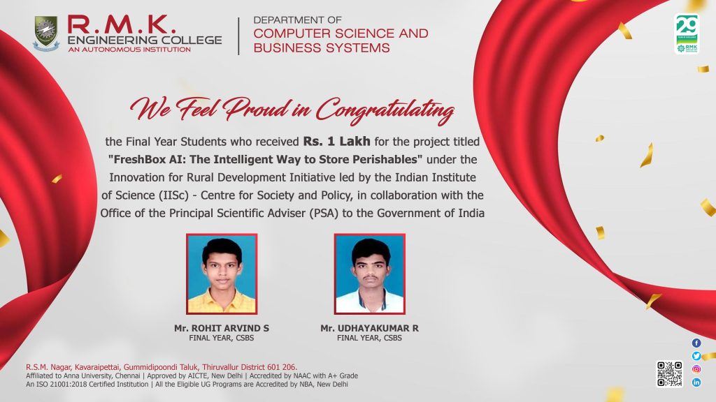 Mr. Rohit Arvind S and Mr. Udhayakumar R (Final Year, CSBS) have been awarded ₹1,00,000 for their groundbreaking project: