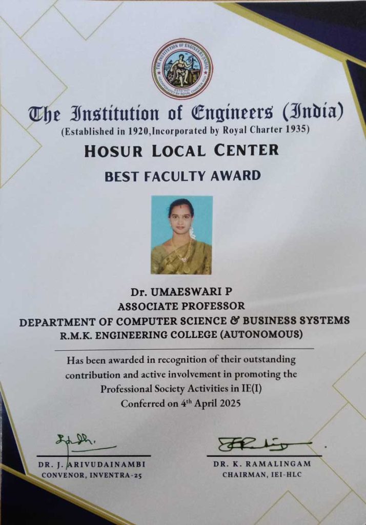 Dr. P. Umaeswari, Associate Professor of CSBS, has been honored with the Best Faculty Award from The Institution of Engineers (India), Hosur Local Chapter on 04 April 2025!